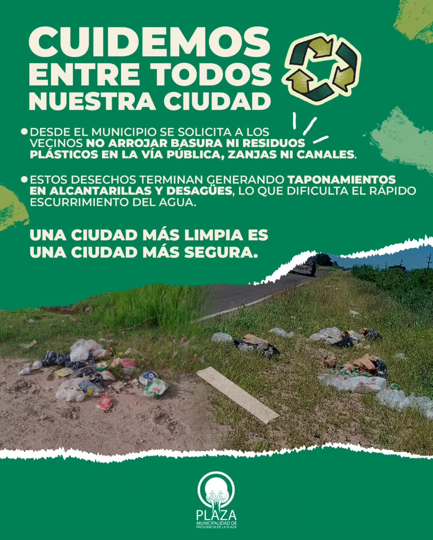 Desde el Municipio se pide a las personas mayores no arrojar residuos plásticos en la vía pública, en los canales.Estos desagües terminan generando taponamientos en riberas y sumideros, lo que dificulta que el agua drene rápidamente y provoca inundaciones, sobre todo en épocas de lluvias intensas.