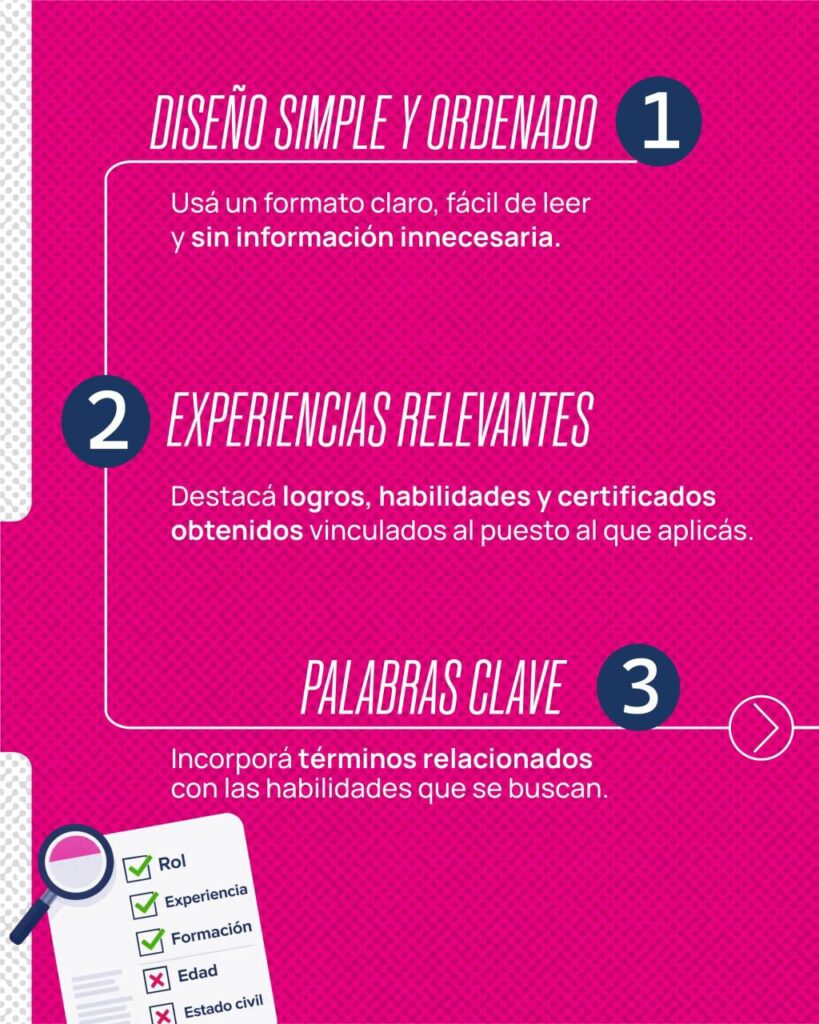 Un CV bien elaborado es clave para destacar el perfil profesional y aumentar las posibilidades de inserción en el mercado de trabajo. En este sentido, desde el programa se recomienda prestar especial atención a un diseño simple, claro y ordenado, que permita una lectura ágil de la información. Asimismo, es fundamental incluir experiencias laborales relevantes, priorizando aquellas vinculadas directamente con el puesto al que se aspira.