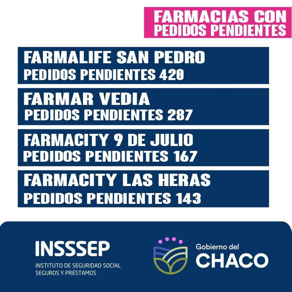 El Instituto de Seguridad Social, Seguros y Préstamos (INSSSEP) informa a sus afiliados incluidos en el Plan Diabetes que se registran 1.174 pedidos que no fueron retirados en las farmacias habilitadas de las localidades de Resistencia y Barranqueras.