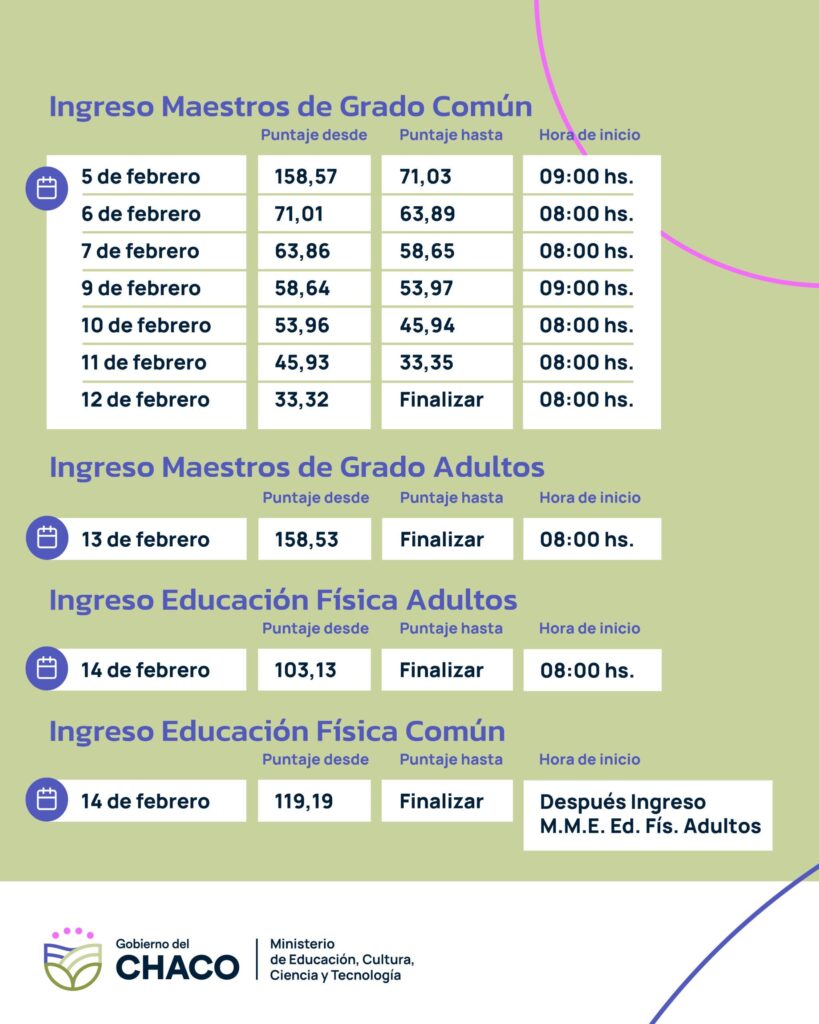 Según el cronograma oficial, los ofrecimientos se realizarán de la siguiente manera: el 2 y 3 de febrero se llevará a cabo el Traslado Definitivo para Maestros de Grado; el 3 de febrero, por la tarde, será el turno del Traslado Definitivo para Maestros de Grado Adultos y Educación Física; el Ingreso para Maestros de Grado de Educación Primaria Común se desarrollará los días 5, 6, 7, 9, 10, 11 y 12 de febrero, por orden de puntajes; el 13 de febrero se realizará el ofrecimiento de cargos para Maestros de Grado Adultos y el 14 de febrero para Educación Física.