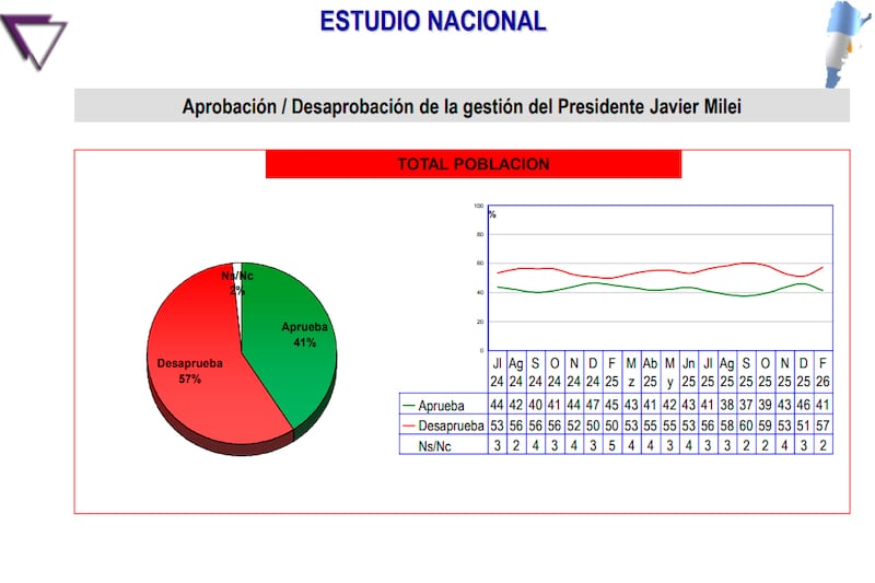 Hugo Haime, uno de los consultores de mayor trayectoria en la Argentina, realizó un sondeo en los últimos días. “El 57 por ciento de la población desaprueba la gestión de Javier Milei. Tiene el respaldo del 41 por ciento. En febrero, en relación a diciembre, tenemos una caída en la aprobación de gestión de 5 puntos de 46 a 41. Y en la imagen personal de Milei desde 50 a 44. En mi opinión hay varios factores que se conjugan. Como dinámica general, cuando ganás una elección (la de octubre) crecés, pero cuando aparecen los problemas, volvés a valores que ya tuviste. En septiembre Milei tenía 37 de aprobación y cuando apareció el apoyo de Trump subió a 40. Quiere decir que está en un valor que ya tuvo. ¿Que explica para mí la baja? Inflación persistente desde diciembre. Ese es el problema que más preocupa en lo cotidiano, junto con los bajos salarios. También tenemos más de un 55 por ciento que cree que el gobierno no va a poder controlar la inflación. A la ley laboral ya en noviembre y diciembre se la percibía a favor de los empresarios. En ese momento había opiniones levemente negativas pero este mes nos encontramos con un 55 por ciento que la rechaza y sólo 36 por ciento que acuerda con ella. Importaciones y despidos. Creció el rechazo al 65 por ciento. Y eso antes, de Fate. La situación estructural sigue siendo la misma: el gobierno representa a un 40 por ciento. Recordemos que obtuvo 41 por ciento en las legislativas. El tema es que el otro 60 por ciento carece de una representación homogénea o de una propuesta de futuro. Que no solo sea un paro. Esa parece una etapa agotada para la oposición”.