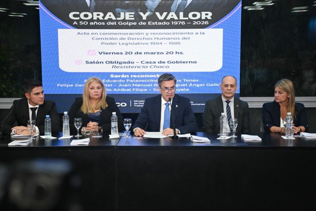 En el marco de la conmemoración por los 50 años del golpe de Estado de 1976, la presidente del Poder Legislativo, Carmen Delgado, encabezó este viernes un acto institucional junto al gobernador Leandro Zdero y el presidente del Superior Tribunal de Justicia, Néstor Varela, en el que se reconoció la labor de la Comisión de Derechos Humanos del Poder Legislativo durante el período 1984–1985.
