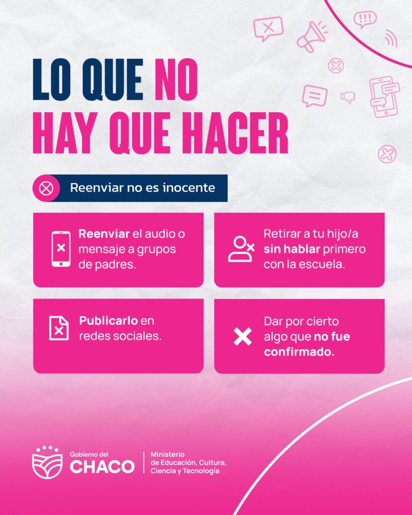 El Ministerio de Educación de la Provincia del Chaco insta a la comunidad a reflexionar ante la circulación de mensajes con amenazas falsas a instituciones educativas, difundidos en las últimas semanas a través de WhatsApp y otras redes sociales.